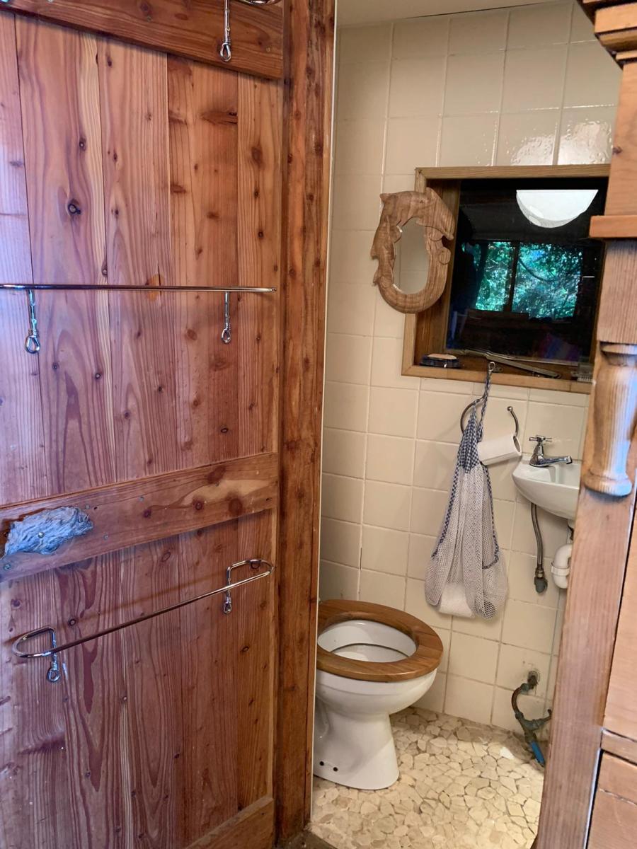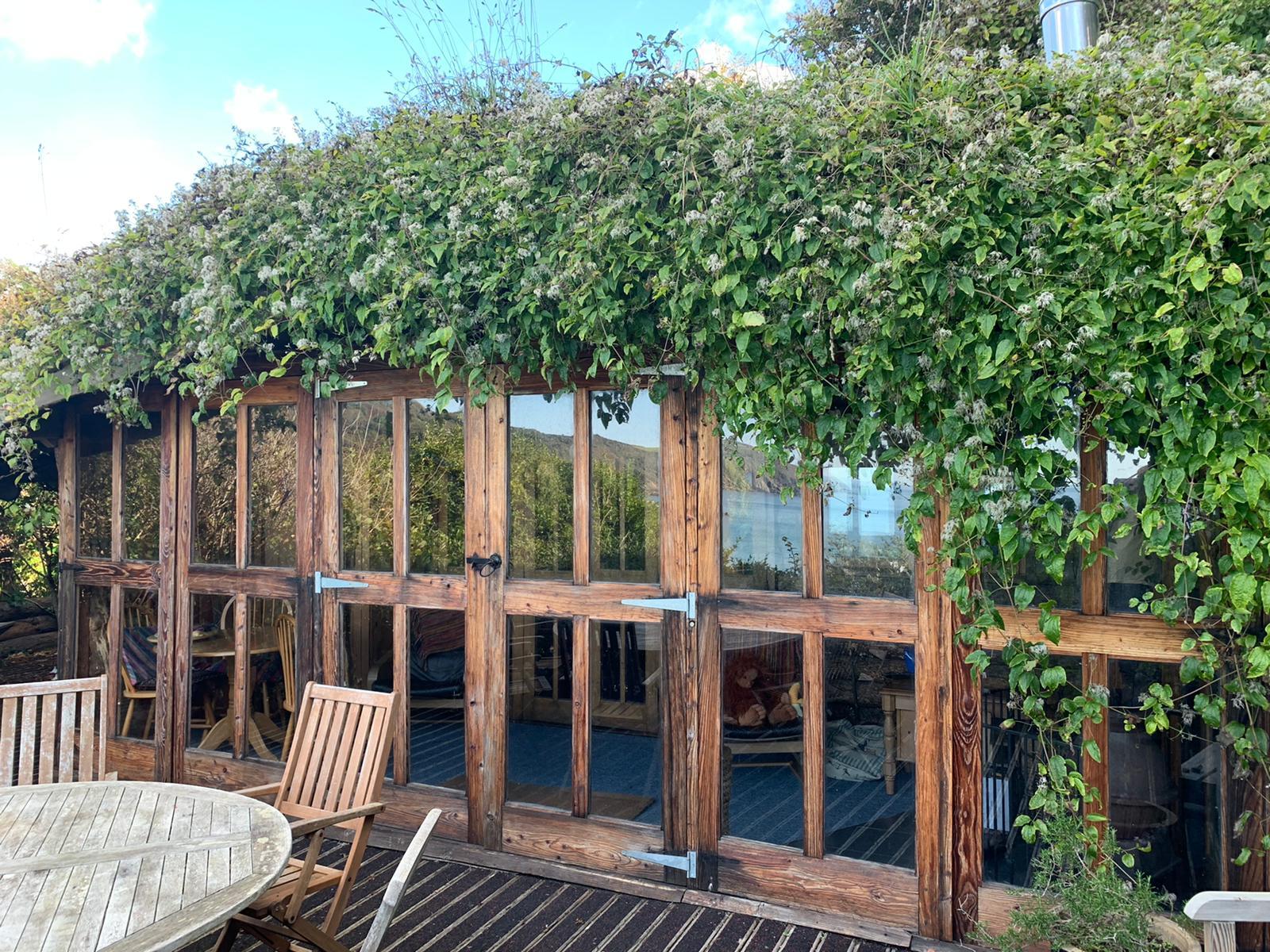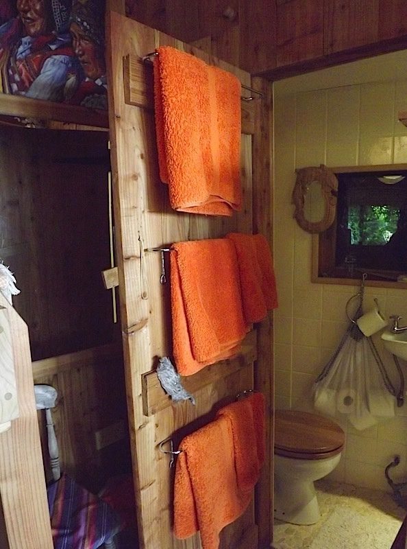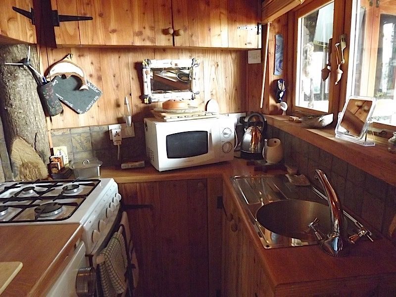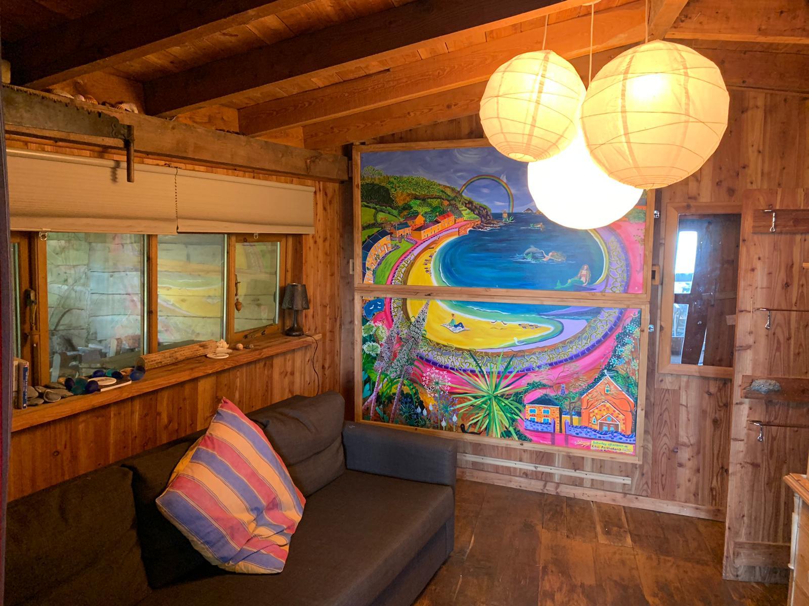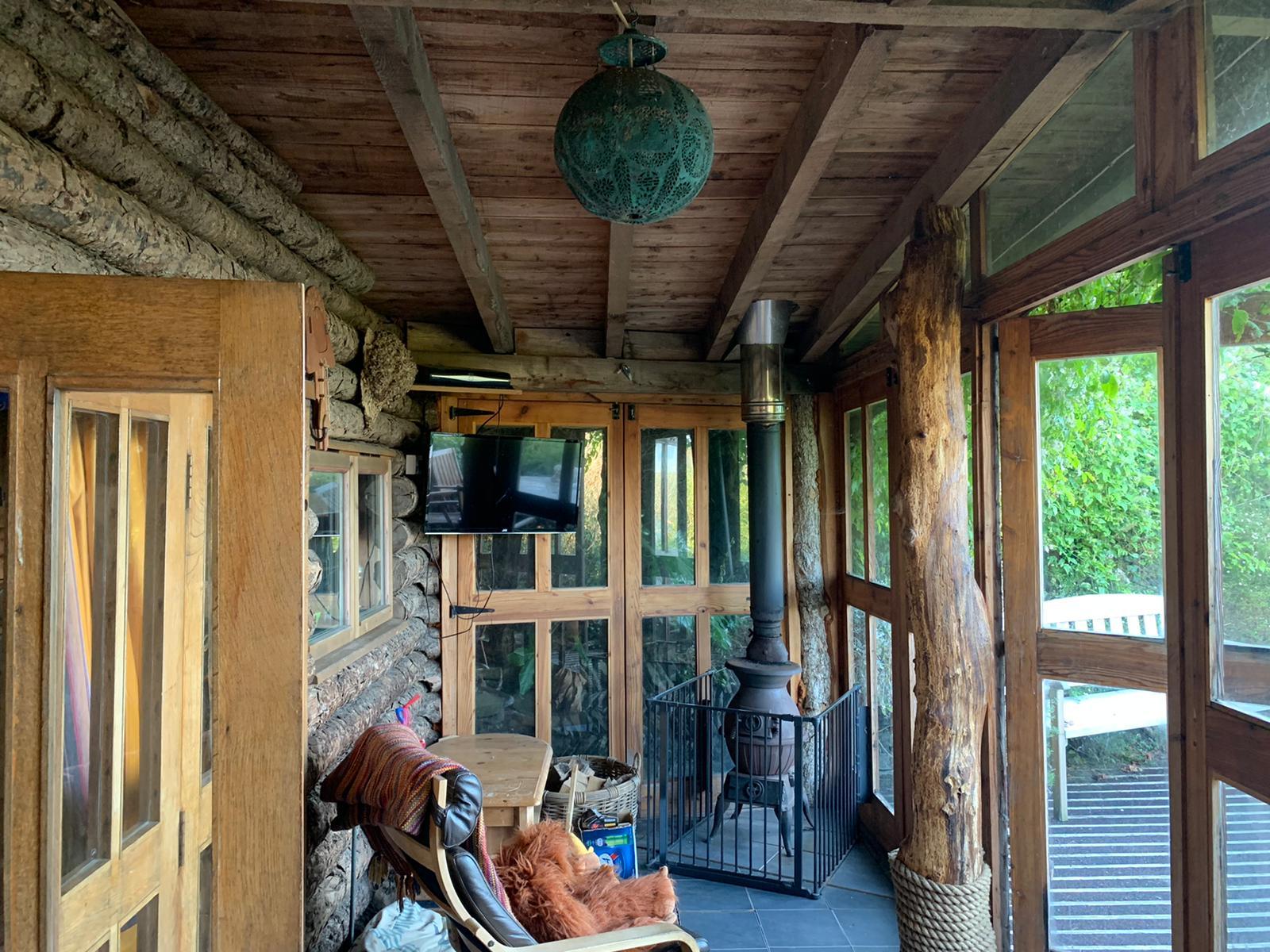 Turn back and enter through double glazed glass doors to the outer cabin where there is a ‘pot-bellied’ wood-burning stove for those cool evenings, a table and chairs, TV and a few books.