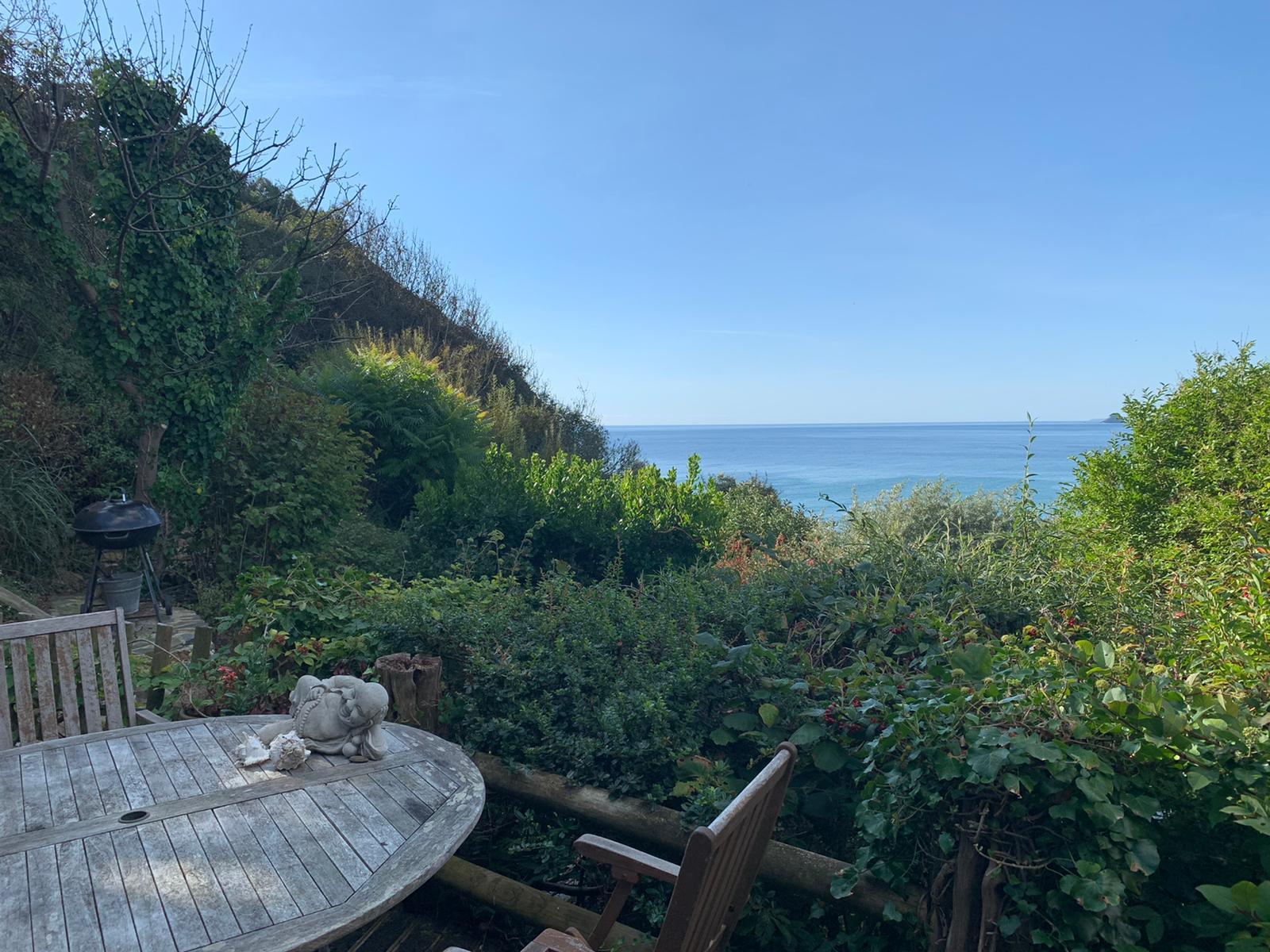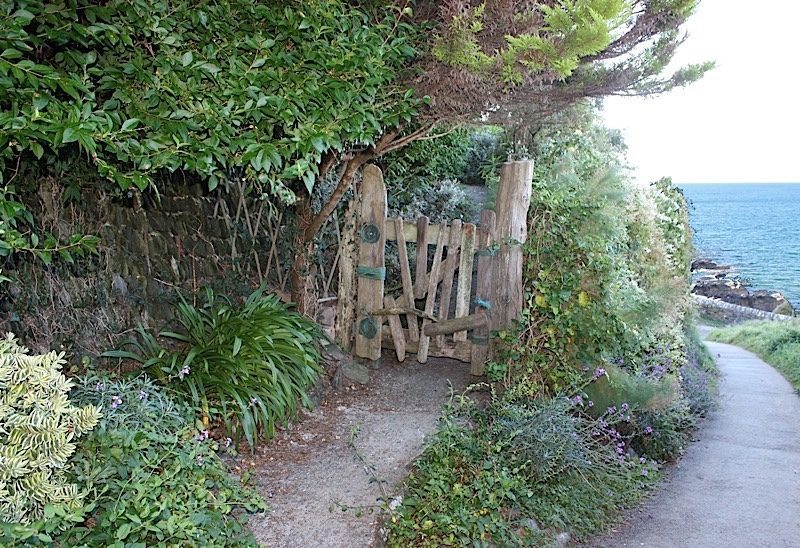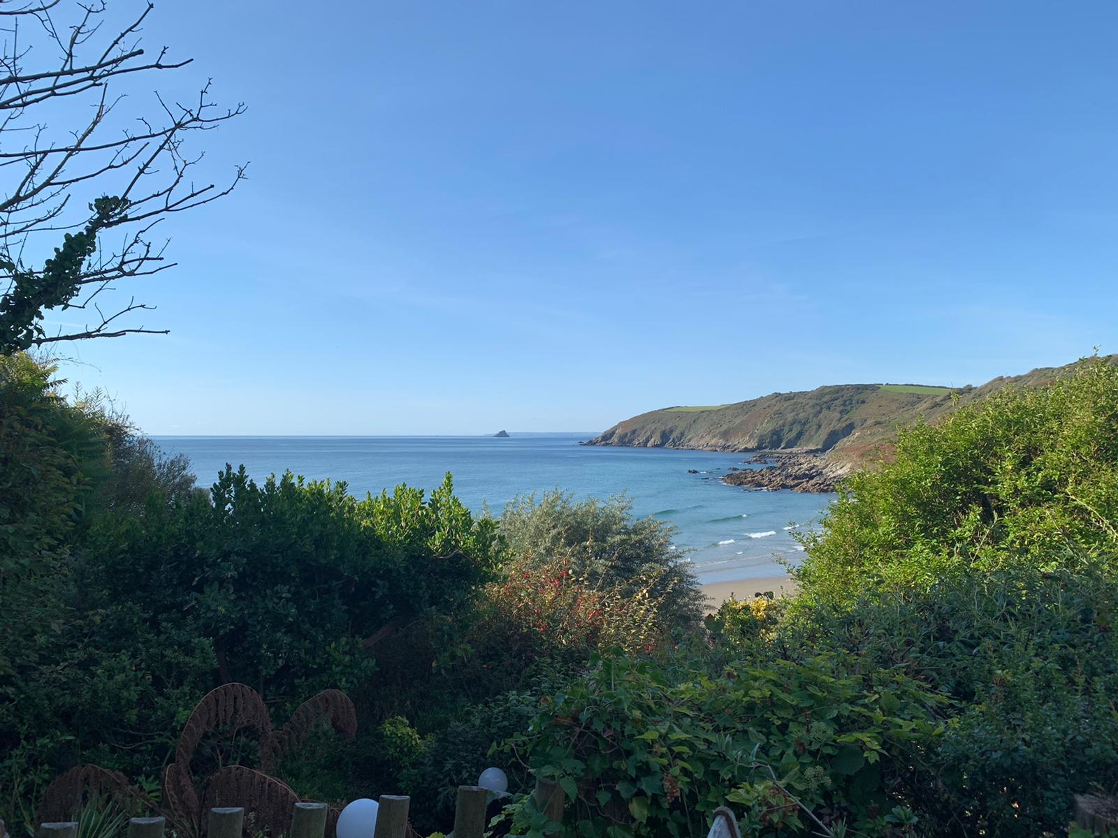 The cabin is on the hillside overlooking East Portholland bay, the coast path and the coastline beyond. After a slight climb up the coast path and a further 24 steps to the decking you can turn and look at the stunning view.